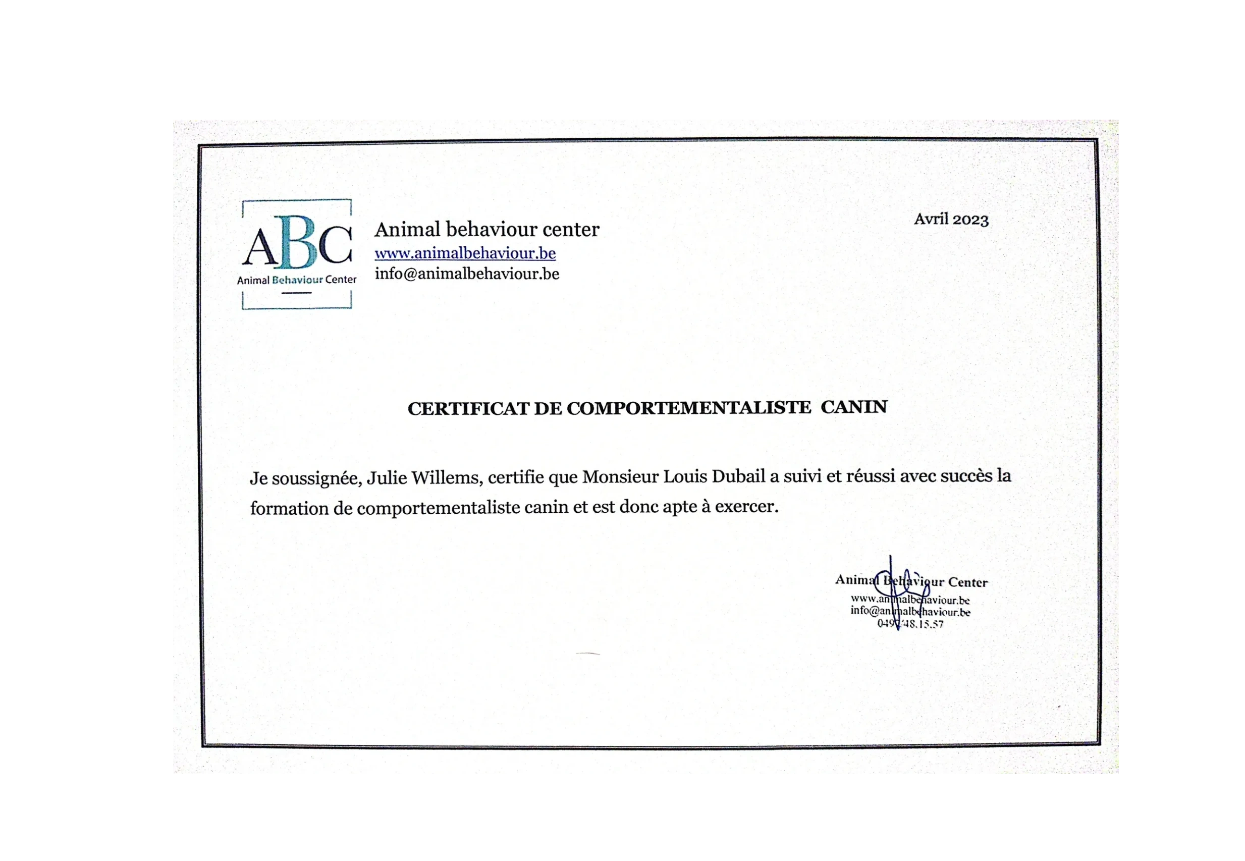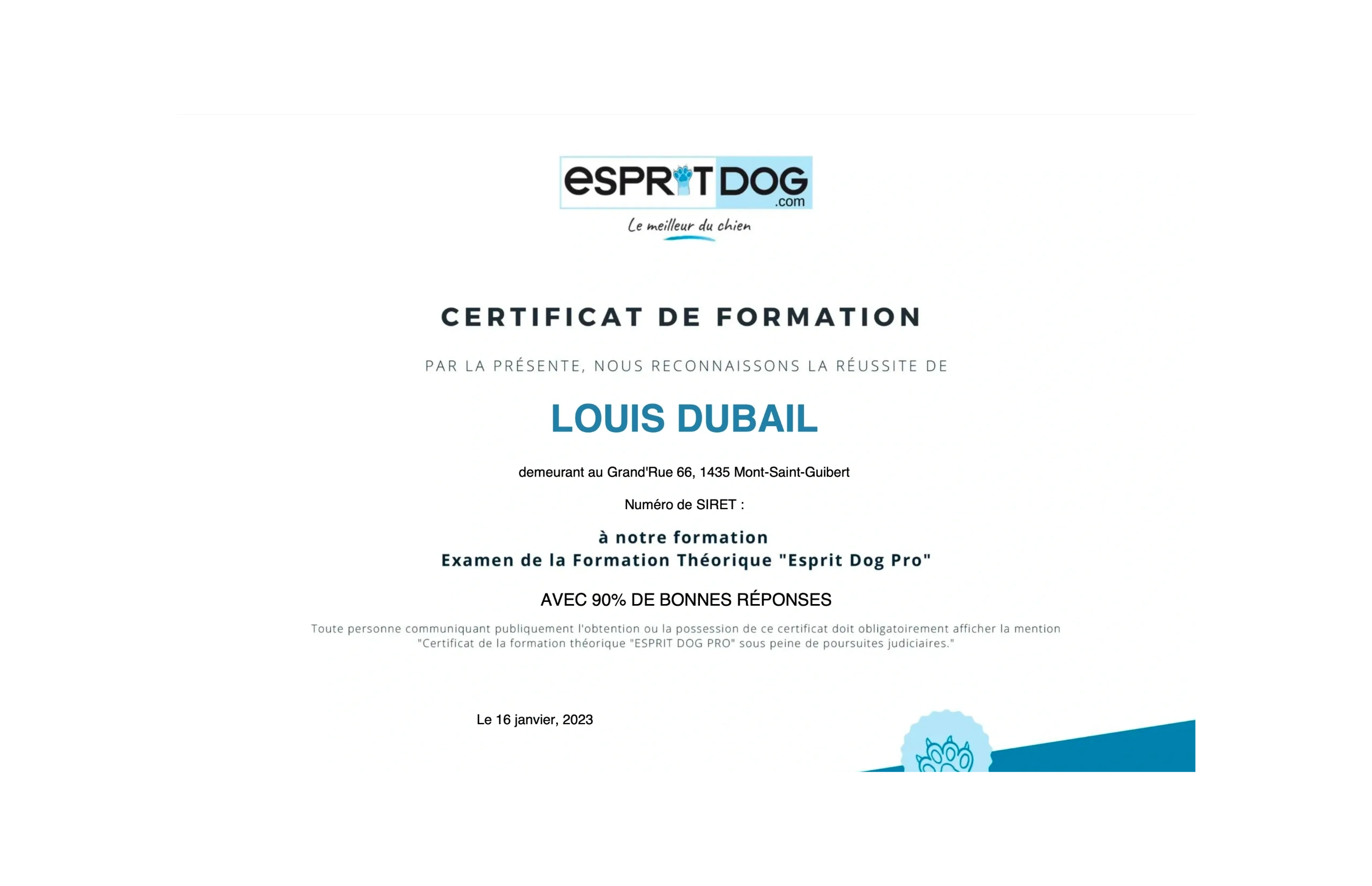 De retour en Belgique, j'ai d'abord suivi plusieurs formations en ligne ainsi que lu une multitude de livres sur l'éducation et l'éthologie canine. C'est alors que la flamme s'est allumée ; je voulais devenir éducateur canin comportementaliste. J'ai donc suivi des formations théoriques et pratiques car je cherchais une formation complète basée principalement sur le renforcement positif et le respect du chien et de son intégrité physique.